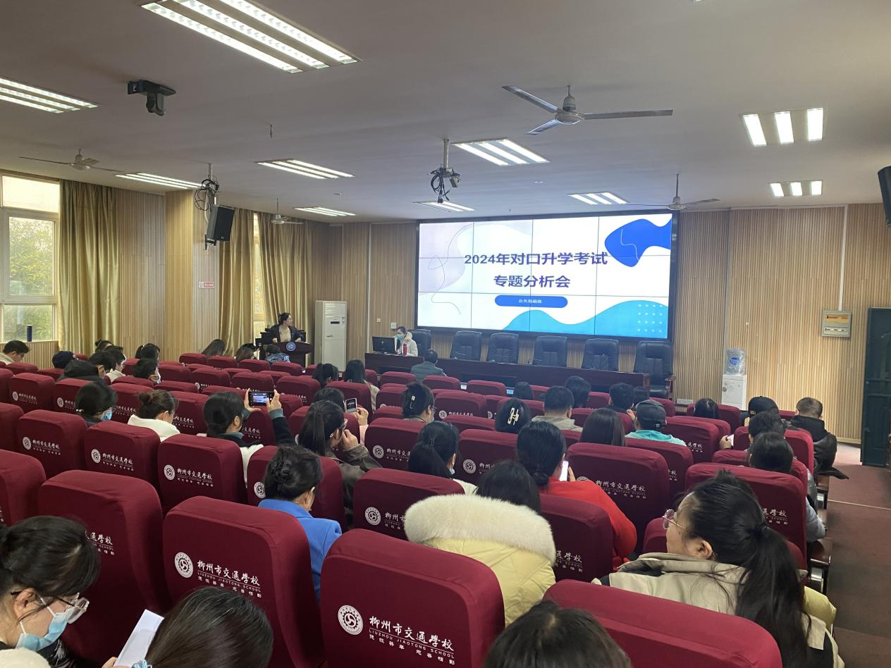为了有效备战2024年的对口升学考试,我校于1月5日下午在第三报告厅召开2024年对口升学考试专题分析会。本次会议由公共基础部覃倩颖副主任主持,各系部教学副主任、升学负责人、升学教学秘书,参加升学补习工作的任课教师以及2022级全体班主任参加会议。