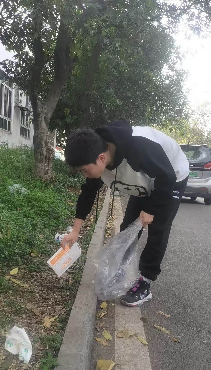 营造良好校园卫生环境,让全校师生在一个干净、 幽雅、舒心的环境中学习和工作,让同学们告别陋习,秉承文明的火炬,加入文明的行列,争做文明的使者,是全校师生的责任。2023级新能源2班唐祚能同学积极响应,从小事做起,从身边事做起,从日常的点点滴滴做起,主动利用课余时间维护校园卫生。