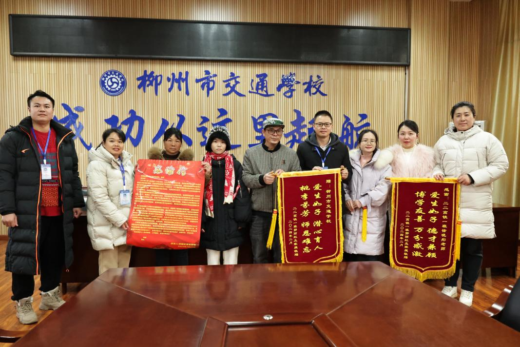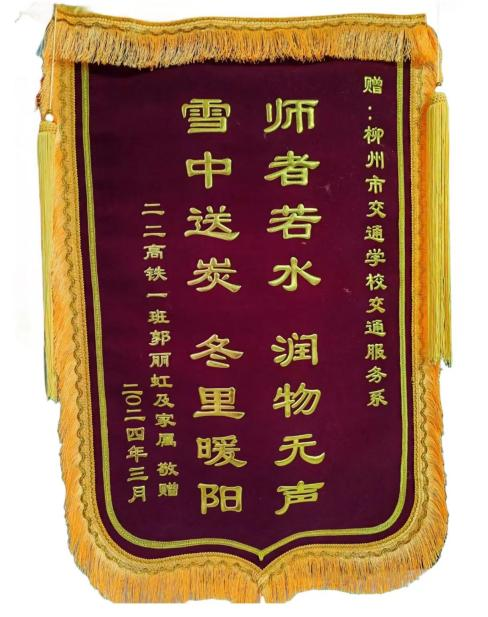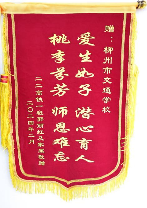 近日,在学校第二报告厅接待了特殊的客人,来自交通服务系22高铁1班学生郭丽虹的父母将一面写着“爱生如子,潜心育人;桃李芬芳,师恩难忘。”的锦旗和一封感谢信送到了学校。他们眼含热泪,激动地说:“是学校师生的紧急救援才挽救了我孩子的生命,是你们挽救了我们的家庭,感谢你们,谢谢。”