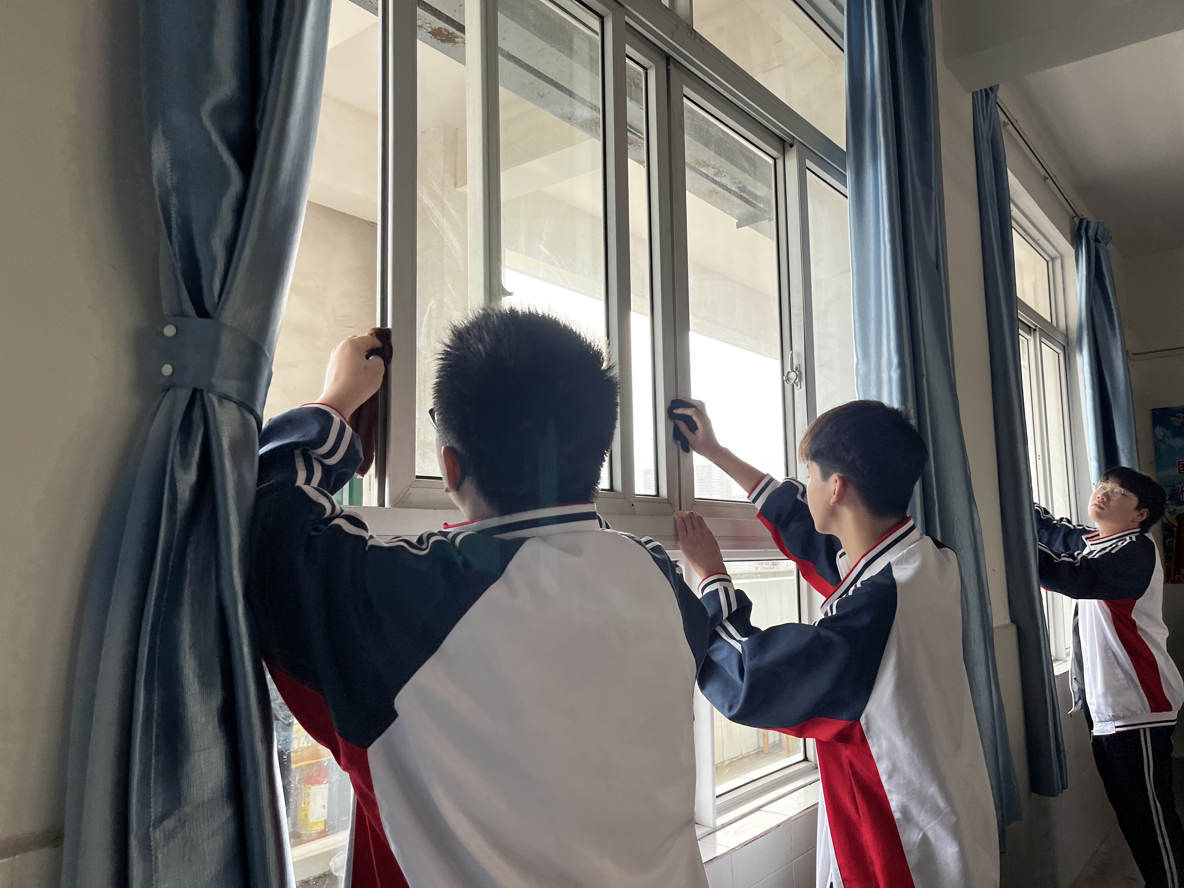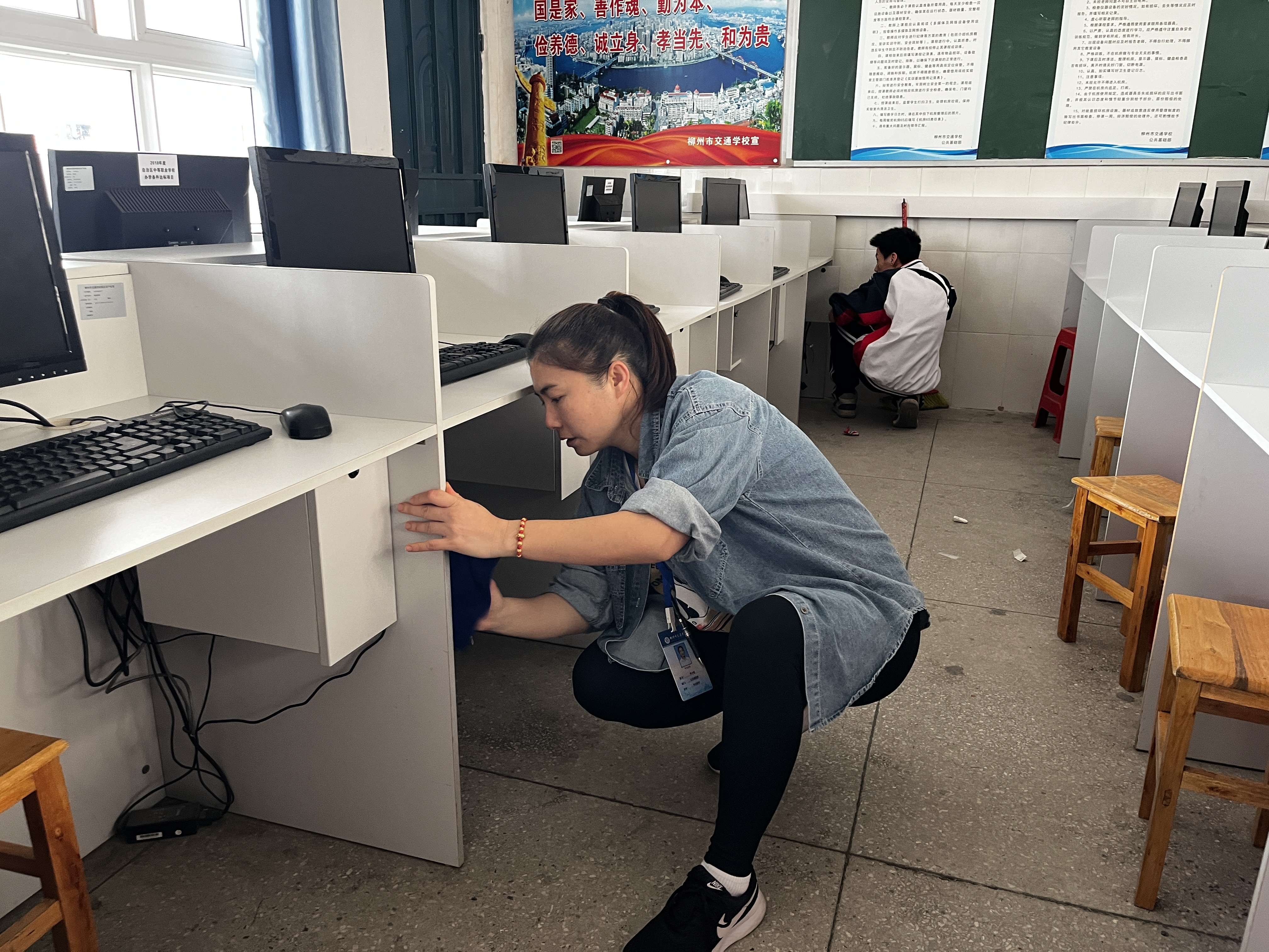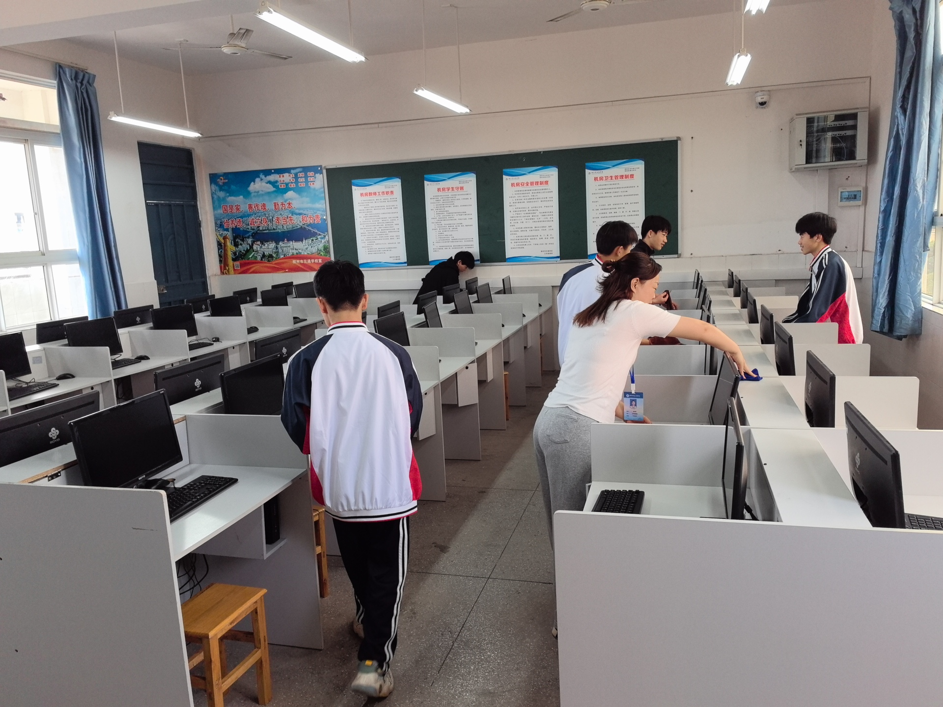 活动开始,我支部党员在明确注意事项后,迅速进入工作状态,认真负责,分工明确。党员和同学们对教室里的桌椅、门窗、电脑设备等进行了全面、细致的擦洗,对地面进行仔细的清扫,无一遗漏。