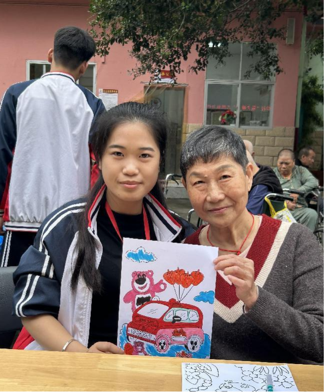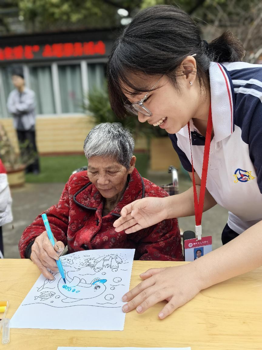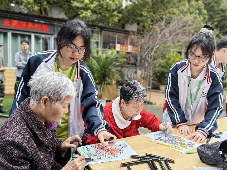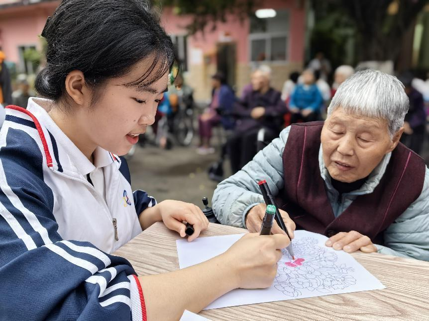 青年志愿者与老人们共同绘画