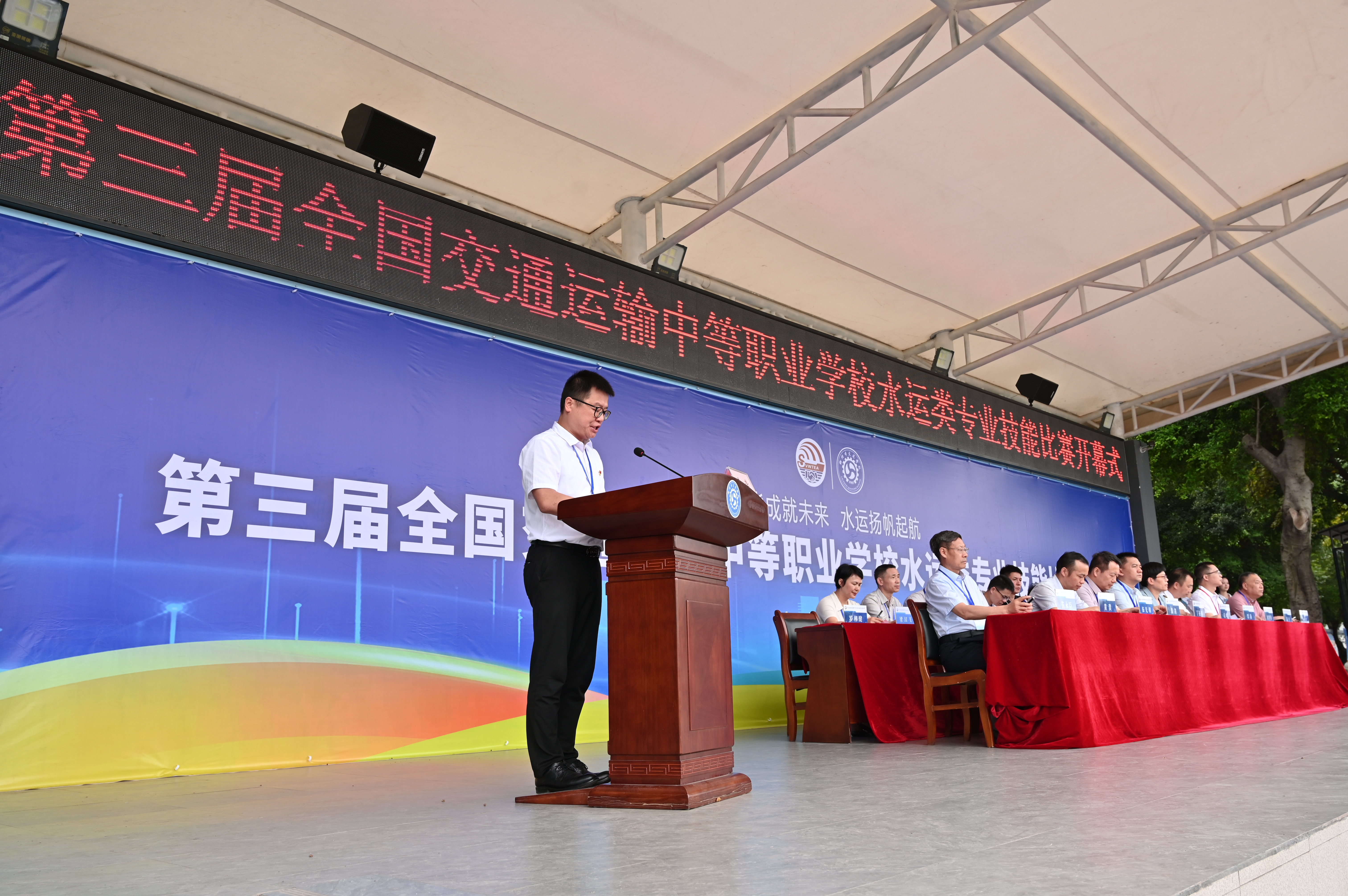全国交通运输业教指委航海专委会丁振国主任出席开幕式并宣布技能比赛开幕。柳州市委教育工委委员、柳州市教育局党组成员、副局长温剑,中职水路运输专业教育联盟主任、舟山航海学校校长袁峻,柳州市交通学校校长黄䶮在开幕式上致辞。开幕式由柳州市交通学校副校长罗柳健主持。