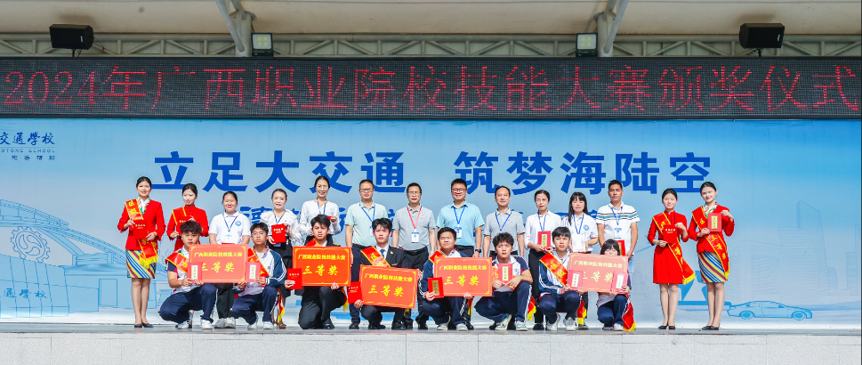 为表彰和鼓励在2024年广西职业院校技能大赛暨第三届全国交通运输中等职业学校水运类专业技能比赛中表现突出的优秀个人、团队及相关指导老师,营造全校“勤学苦练,敢于拼搏”的良好学风,5月13日上午,我校举行2024年广西职业院校技能大赛暨第三届全国交通运输中等职业学校水运类专业技能比赛颁奖仪式。学校党委书记廖增勇、校长黄䶮、副校长周轶群、副校长罗柳健出席,仪式由教务科研处主任潘雪玲主持。