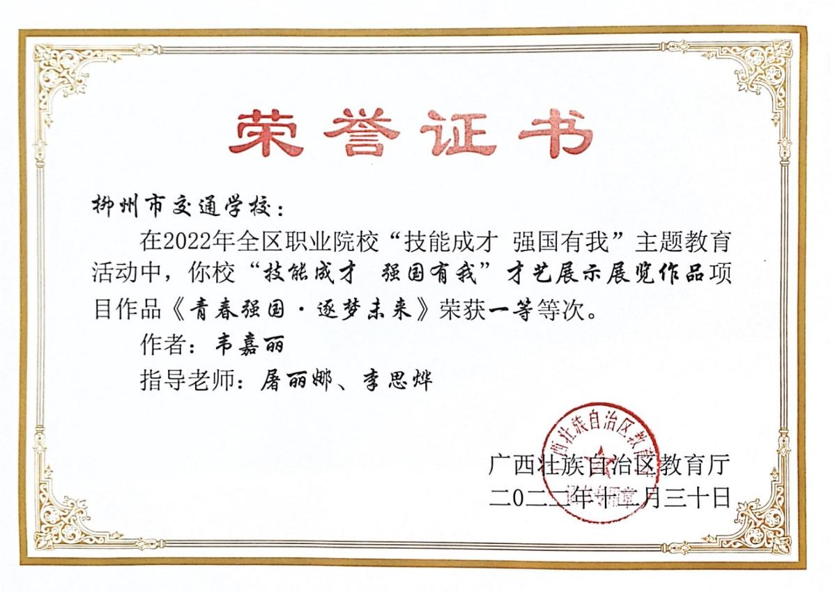 2021-2022学年获自治区人民政府中等职业教育奖学金和柳州市交通学校“三好学生”。
