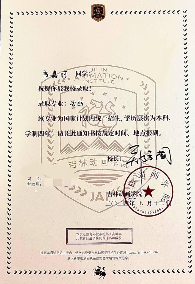 2024年考入吉林动画学院(动画专业)。