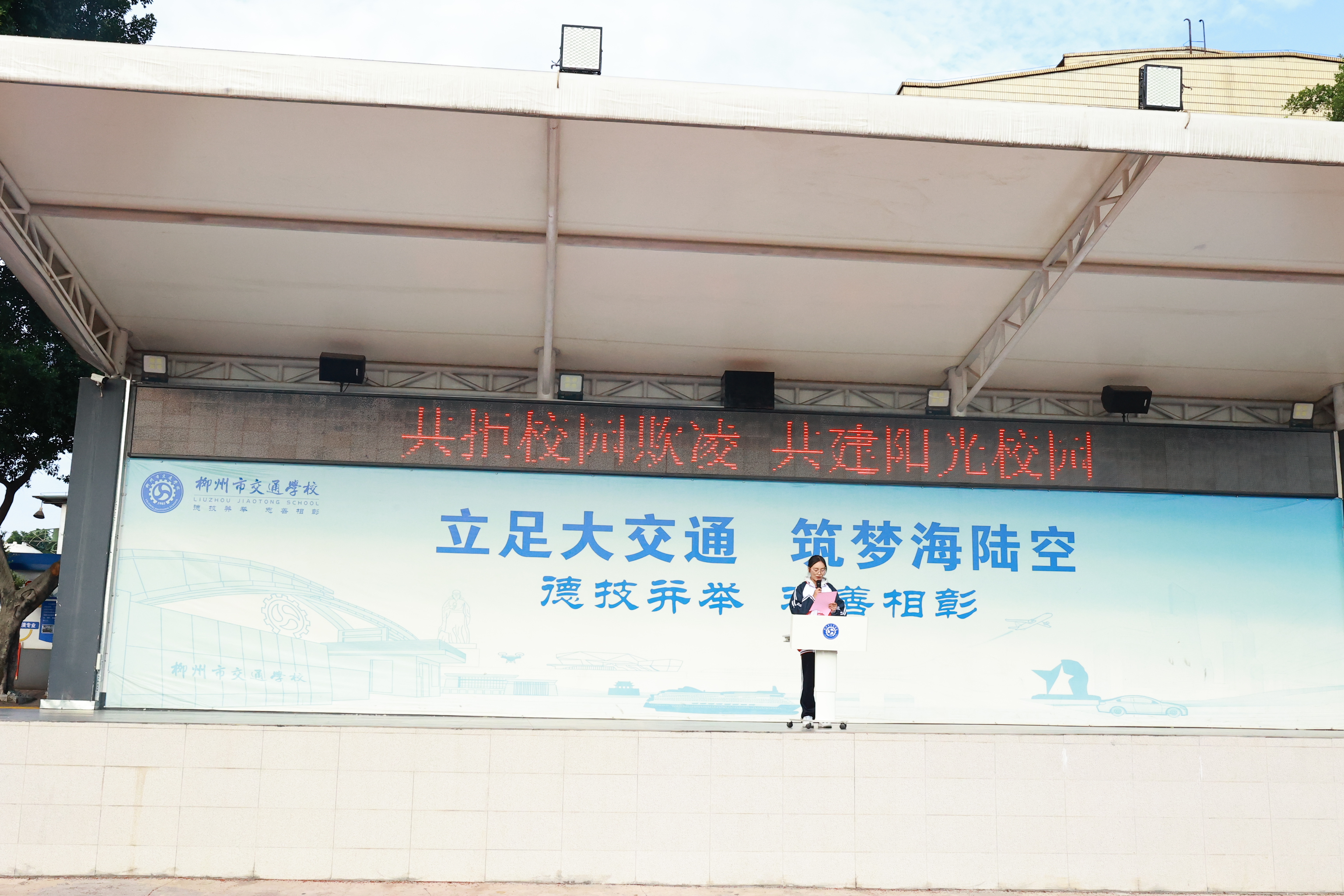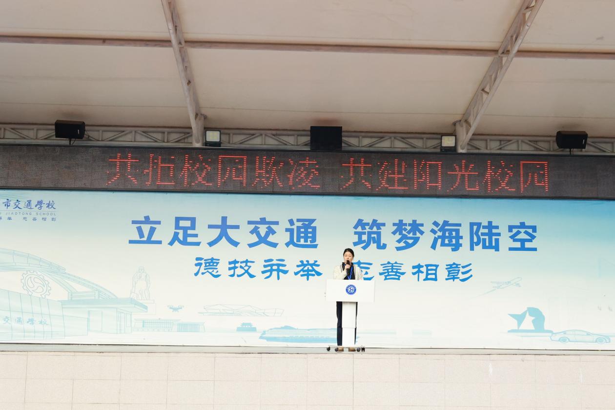 24邮轮1班学生代表刘艺婷向全体同学发起“共拒校园欺凌,共建和谐校园”的倡议,呼吁同学们遵纪守法,提升修养,拒绝校园欺凌,从我做起,从现在做起。