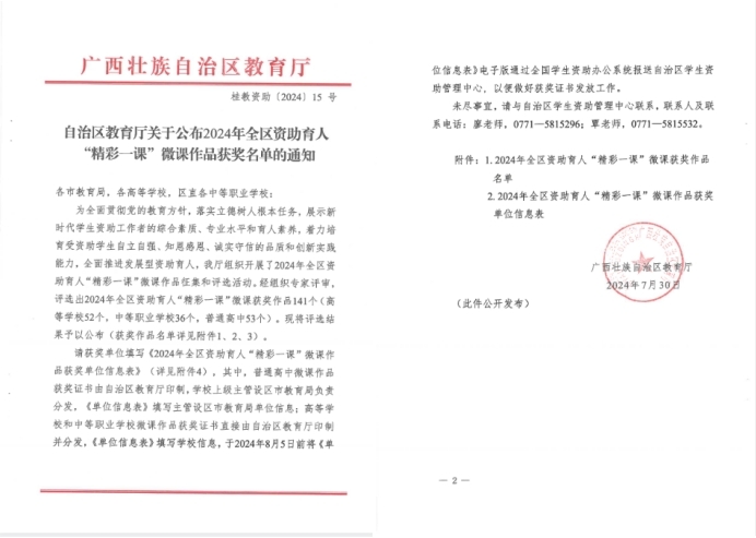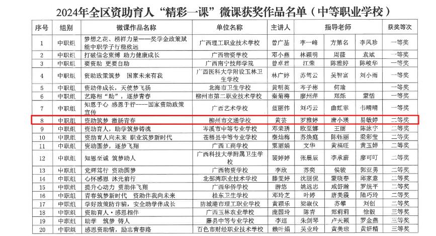 近日,自治区教育厅公布2024年全区资助育人“精彩一课”微课作品获奖名单,我校黄芸老师荣获2024年全区资助育人“精彩一课”微课作品二等奖。